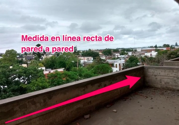 Cuando se trata de una baranda para un balcón o doble altura, se debe tomar la línea recta de pared a pared. En este caso, adjuntamos una foto ejemplo y las medidas que se deberían tomar: