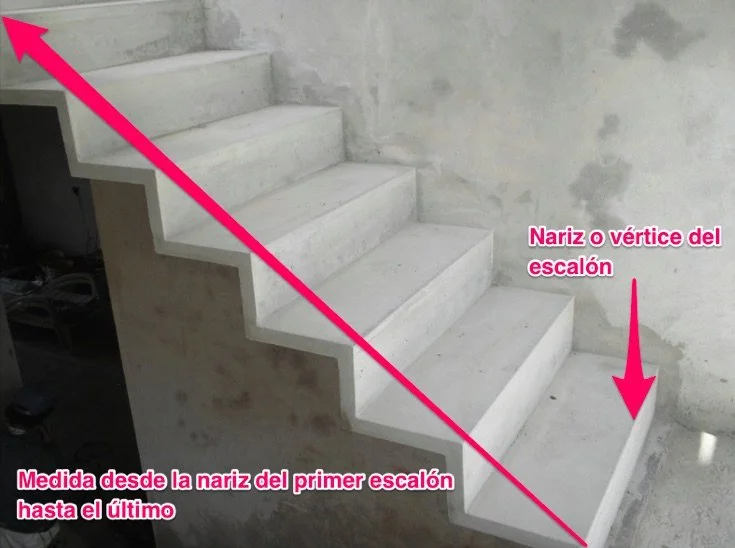 Cuando se trata de una baranda para escalera, la idea es similar, pero se deben tomar los metros en diagonal o rampantes. Siempre desde la nariz del primer escalón y hasta la nariz del ultimo escalón, descanso o llegada.