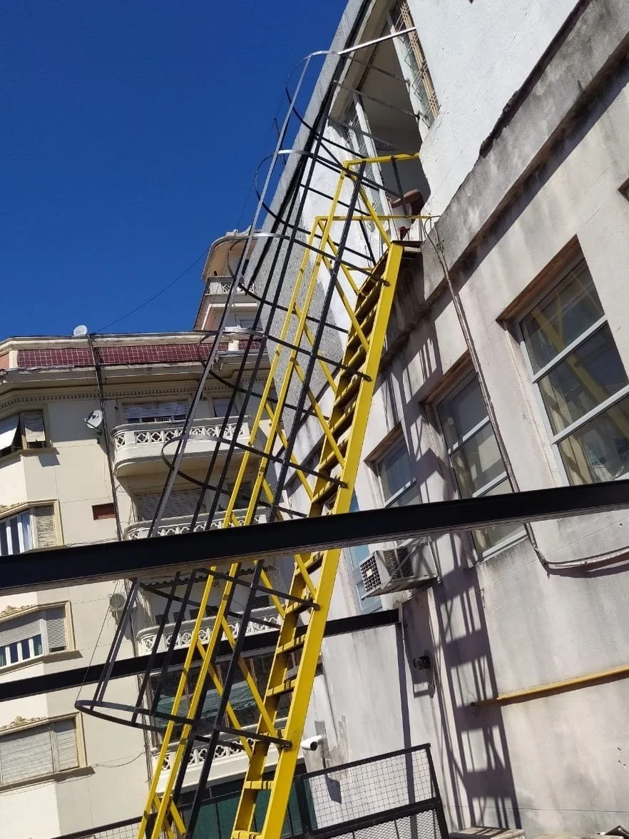 En las escaleras de escape o incendio las pedadas suelen ser anchas, la inclinación es leve y en el desarrollo final se suelen utilizar una cantidad generosa de metros, en forma de "O", "U", "L" o simplemente rectas. Los descansos sólo pueden ser enteros y no se pueden usar los compensados.